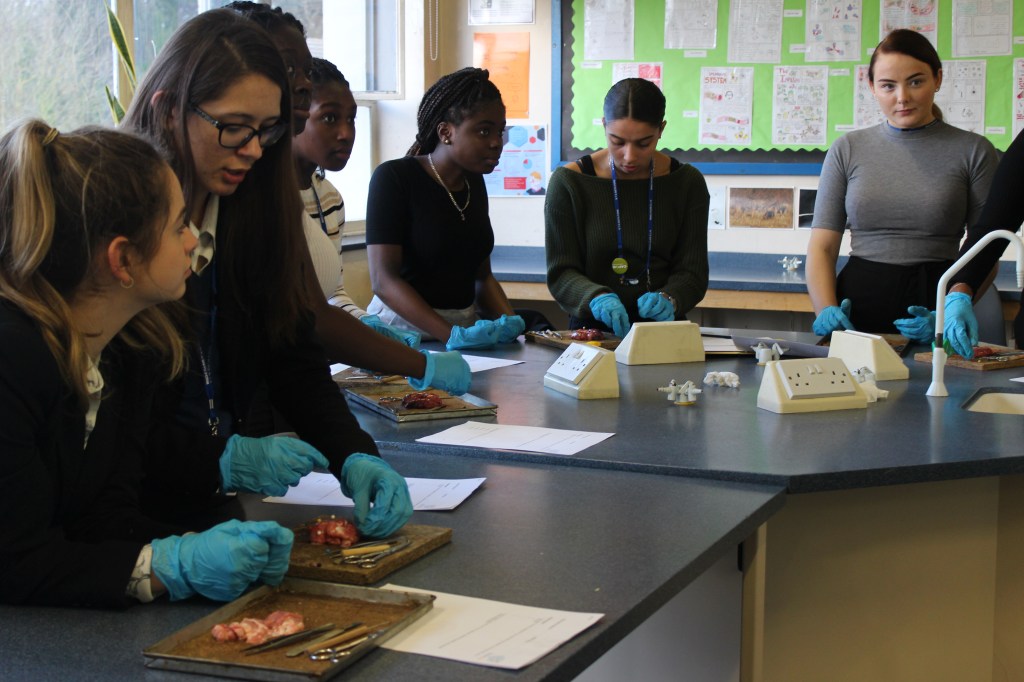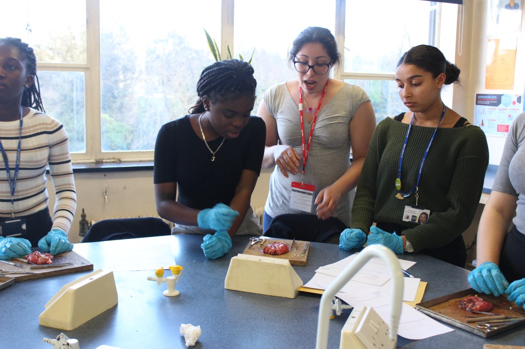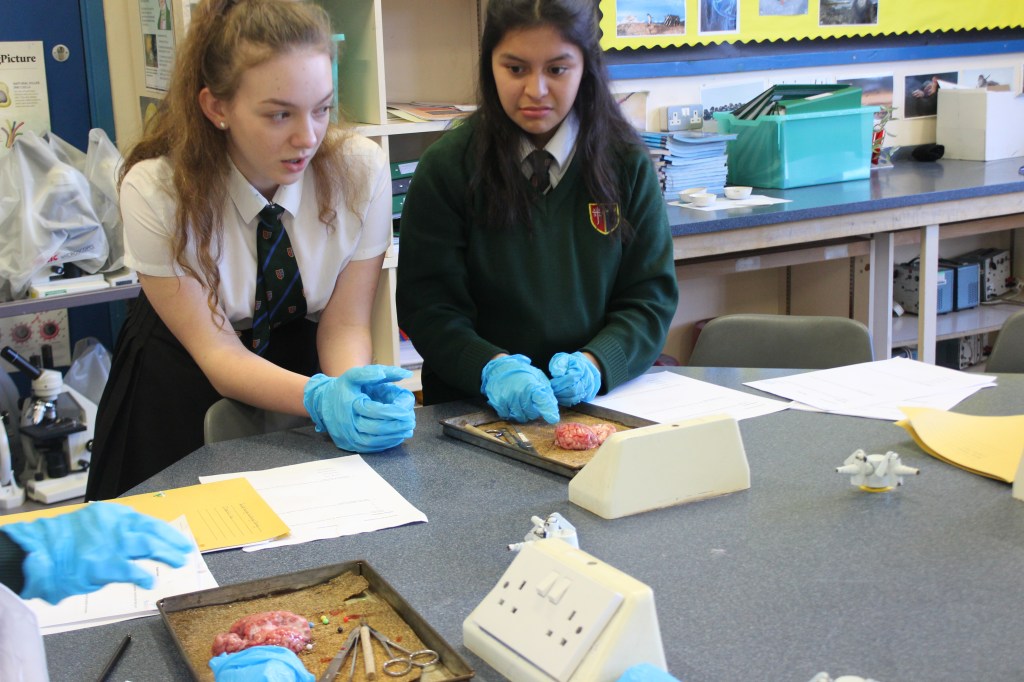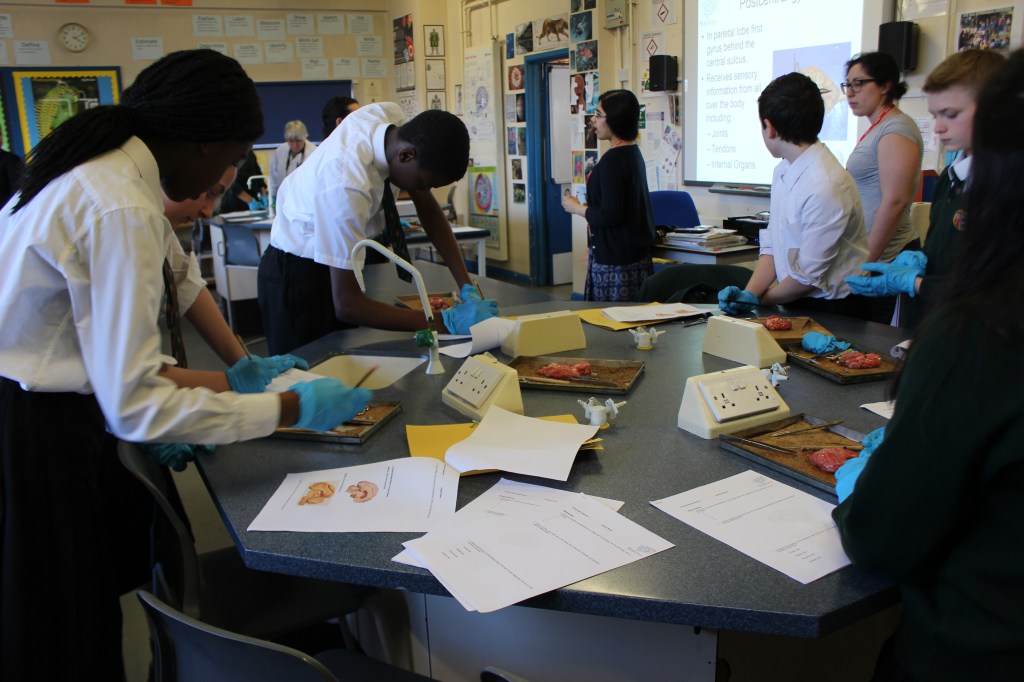 Three local British Brain Bee volunteers attended a local secondary school in Streatham, London, for a brain anatomy-related activity. More than 30 students from the Thomas Bishop Grant School attended the after-school event, where volunteers gave a brief introduction to brain structures and functions. Alongside the presentation, students dissected sheep’s brains and located the various brain structures discussed during the talk.