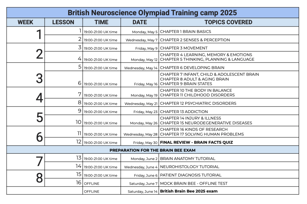 This 8-week online training program is designed to help highly motivated secondary school students develop a strong foundation in neuroscience and excel in the Neuroscience Olympiad.