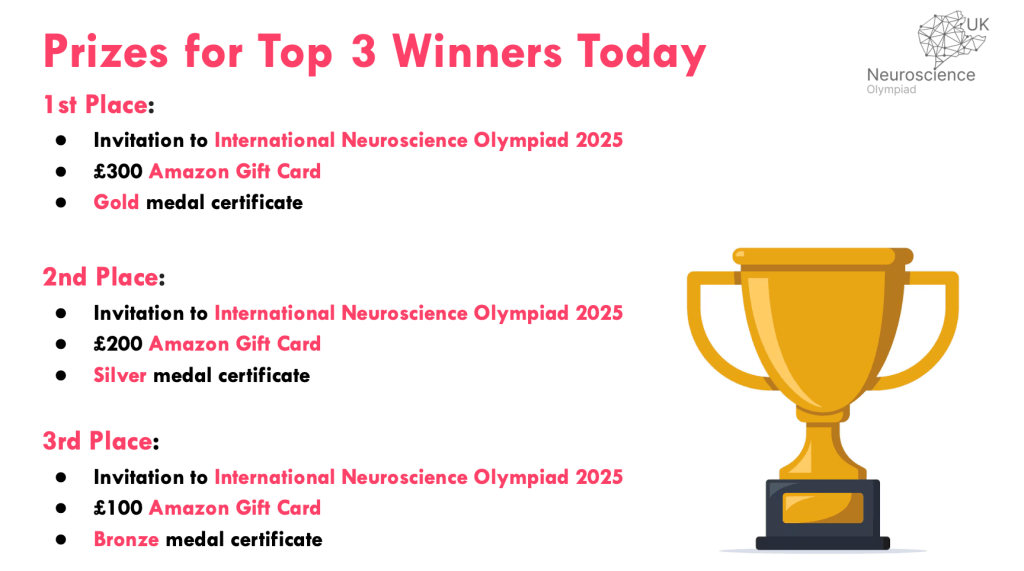 The top 10 participants received official rankings and certificates, while the top three winners were awarded Amazon gift cards and full sponsorship to compete in the International Neuroscience Olympiad. A virtual group photo with participants and judges marked the close of the event.
