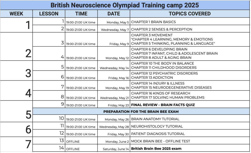 This 7-week online training program is designed to help highly motivated secondary school students develop a strong foundation in neuroscience and excel in the Neuroscience Olympiad.